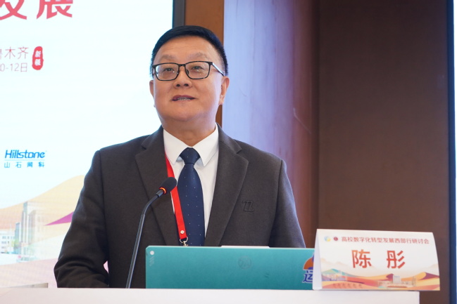 主旨报告环节,清华大学信息化工作办公室主任、分会副秘书长张小平,新疆师范大学党委常委、副校长陈彤分别作题为《AI赋能教学实践与思考》《数字化助推高校铸牢中华民族共同体意识教育的路径与方法》的报告。