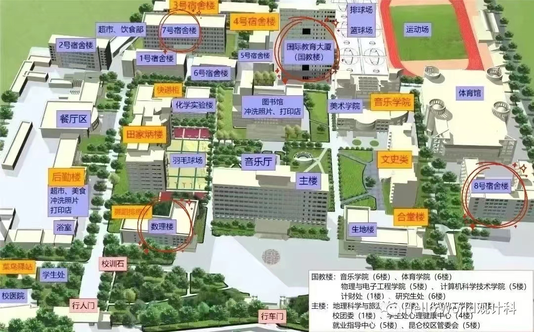 圆圈圈出来的地址是同学们上课和宿舍的地点。请各位同学保存地图哦,探索校园。