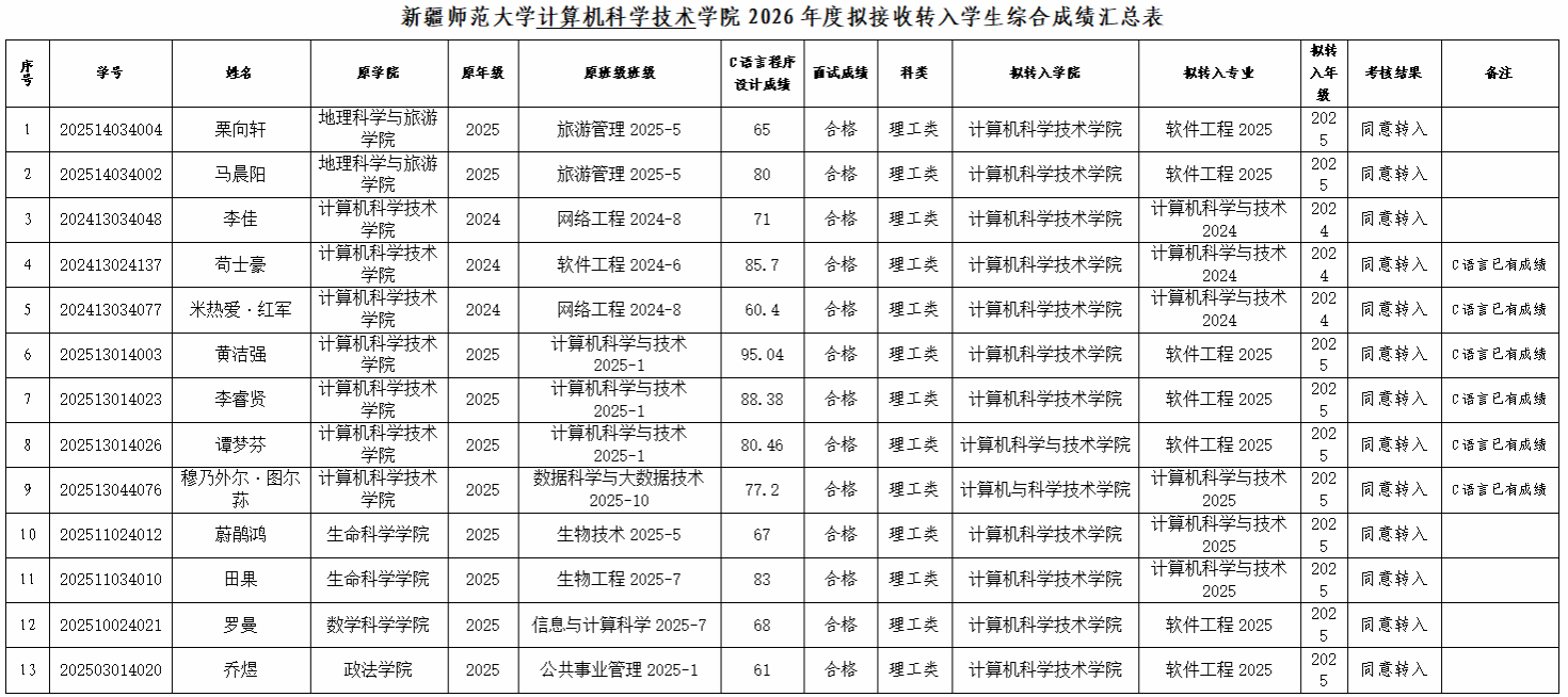 根据教育部令第41号及《新疆师范大学普通本、专科学生转专业实施细则》的相关规定,按照我校2026年度普通本、专科学生考试(考核)转专业整体工作安排,经搜球吧 考核,现将拟接收转入学生名单公示如下: